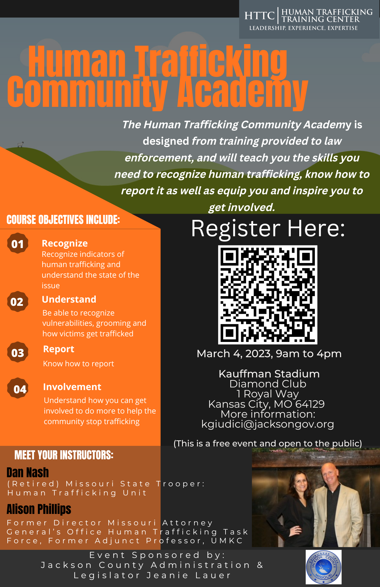 Jackson County and the Human Trafficking Training Center are holding a free Human Trafficking Community Academy March 4, 2023, from 9:00 a.m. to 4:00 p.m. at Kauffman Stadium Diamond Club.